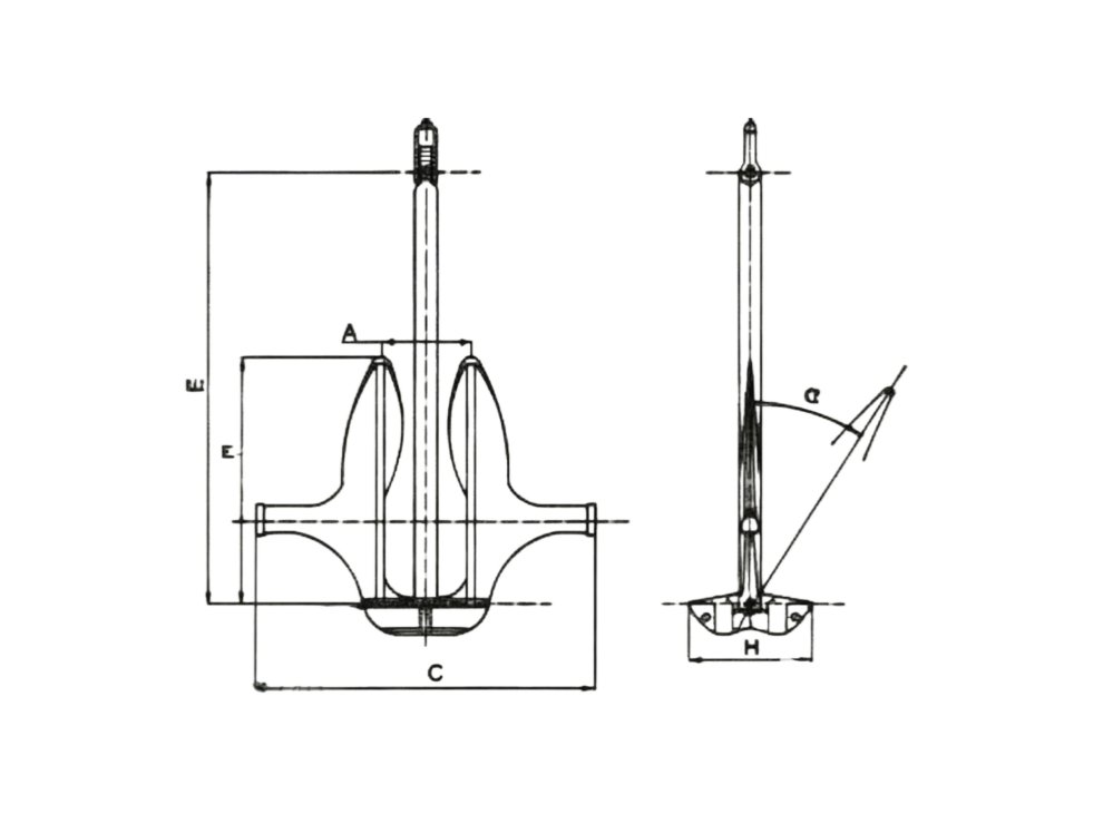 El ancla AC-14 es un ancla HHP sin cepo con una corona de anclaje ancha, aletas gruesas y largas y costillas longitudinales.